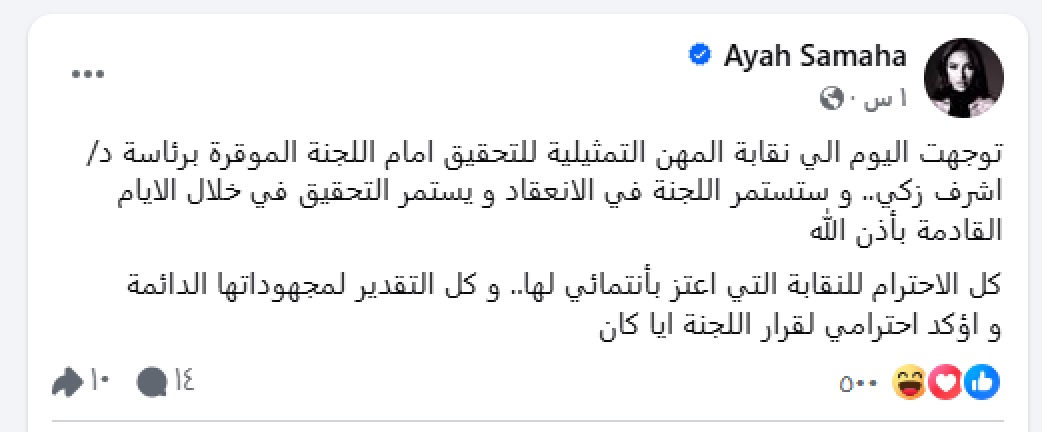 واختتمت حديثها بالقول: "كل الاحترام للنقابة التي أعتز بانتمائي إليها، وكل التقدير لمجهوداتها الدائمة، وأؤكد احترامي لقرار اللجنة أياً ما كان".