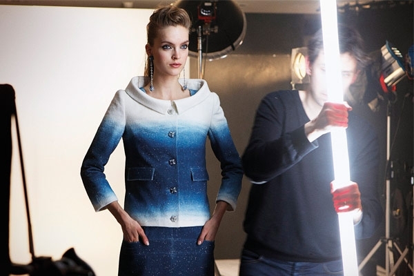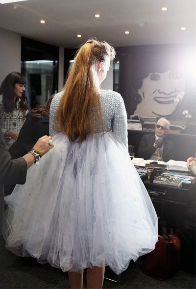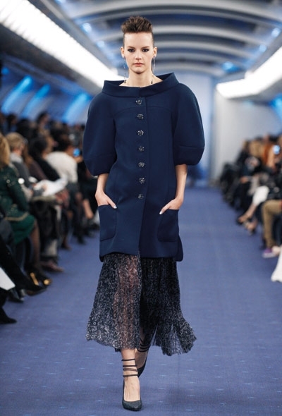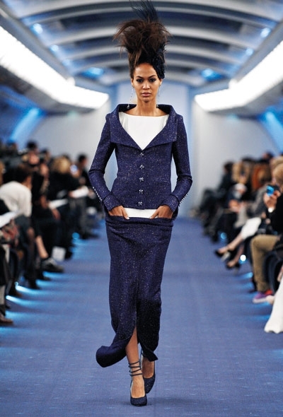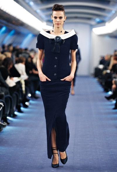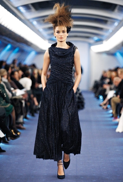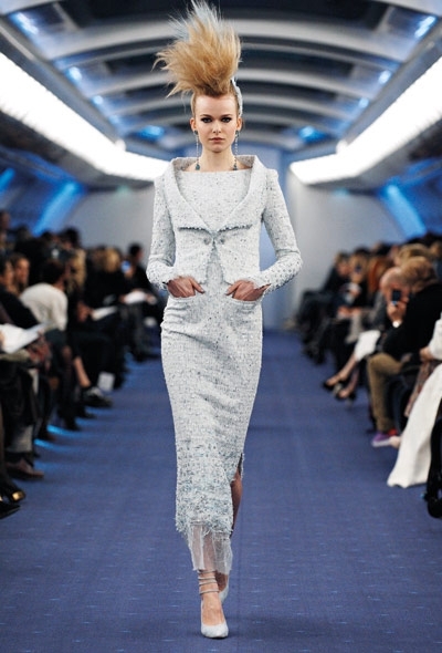 حين بدأ العرض، كان الحضور مفتوناً أصلاً بما شاهده لغاية الآن. لكن الملابس كانت هي أيضاً محط إعجاب إذ قدّم لاغيرفيلد رؤيته لمضيفات السفر في حقبة الستينات من القرن العشرين مع الخصور المنخفضة والظلال الزرقاء المتنوعة. التصاميم كانت أيضاً رحلة من حقبات العشرينات والستينات والثمانينات. قصات نحيلة مع حجم حول الحاشية. راوحت التركيبات من التويد الكلاسيكي إلى الدنيم المحبوك بالبرق اللماع. كل تفصيل كان له معنى، وبدا أن كارل برع في ما قام به. أحببت أيضاً الجوارب المزخرفة ومجموعات النجوم التي سطعت مباشرة فوق الركبة بحيث جمعت الحاشية مع الجوارب.