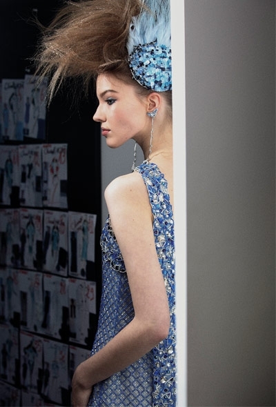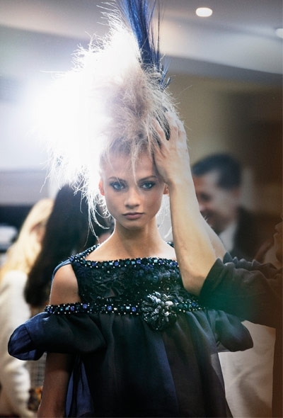 اعتمدت العارضات تسريحات الشعر العالية مما شكّل مثالاً على تحدي الجاذبية. وتم تأطير العينين بخط كحلي فيما بقي كل شيء آخر بسيطاً. أما الماكياج فخفيف جداً على الوجنتين والشفتين، فيما تألقت الأظافر بلون أزرق فاتح. إلا أن المجموعة الحصرية للألوان سيتم الكشف عنها في تموز/يوليو 2012.