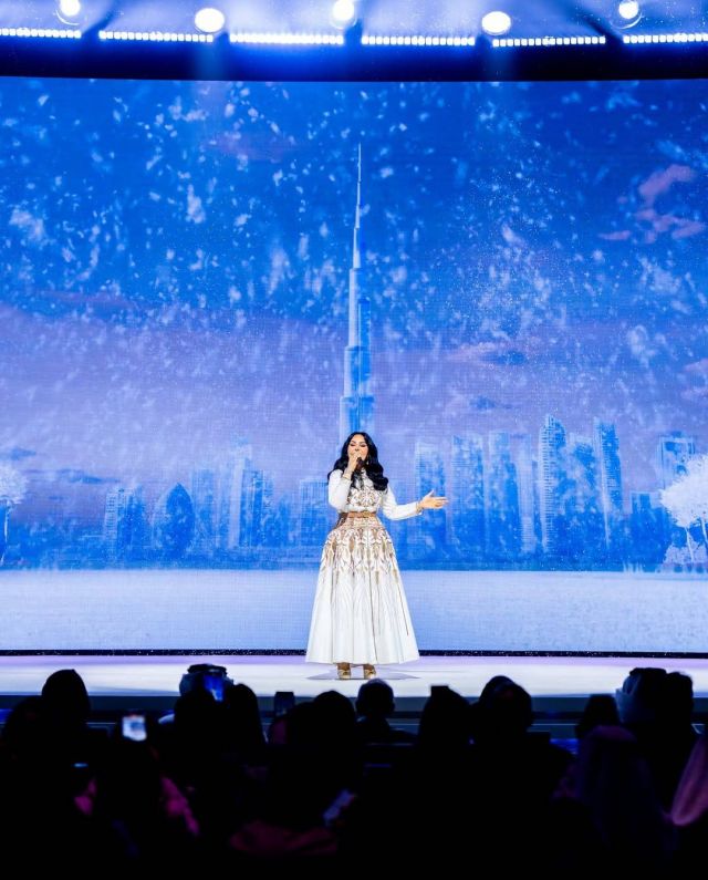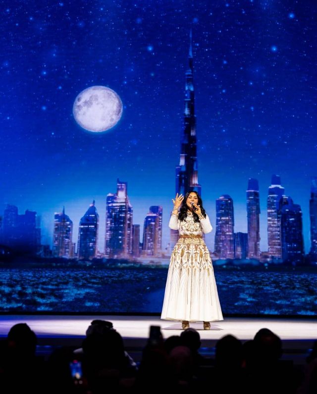 اختارت النجمة أحلام فستاناً ناعماً بتفاصيل شرقية رقيقة خلال مشاركتها في منتدى الإعلام العربي في دبي، حيث قدّمت أشهر أغانيها وأشعار سمو الشيخ محمد بن راشد آل مكتوم.