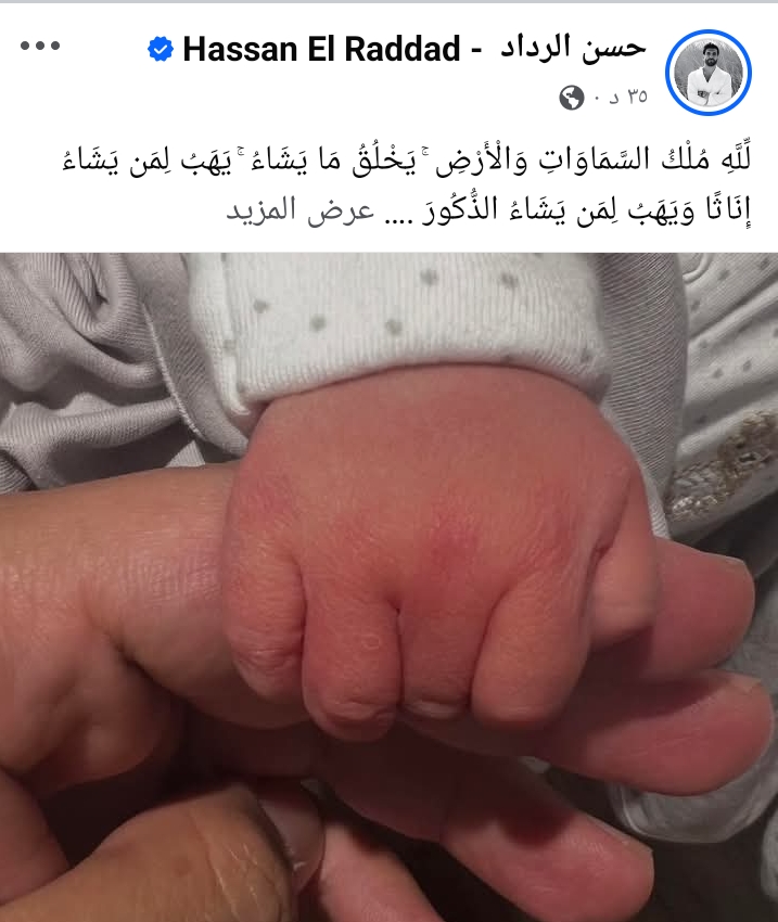 تابع: "الحمدلله ربنا زقنا بالطفلة الجميلة فادية الرداد، اللهم بارك لنا فيها وارزقها الصحة والعافية وارزق الناس جميعا".