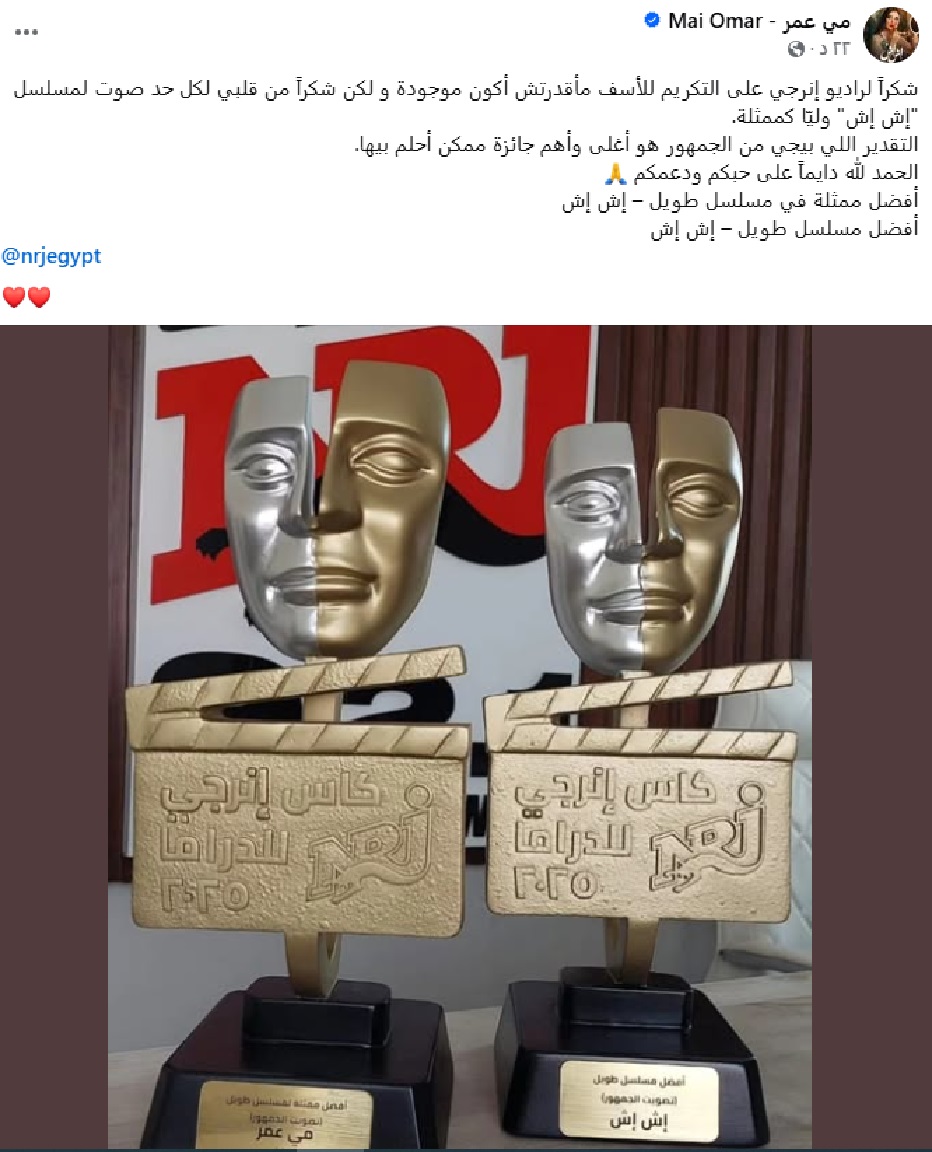 وكتبت مي قائلةً: "شكراً لراديو إنرجي على التكريم، للأسف مقدرتش أكون موجودة، ولكن شكراً من قلبي لكل حد صوّت لمسلسل "إش إش" وليّا كممثلة".