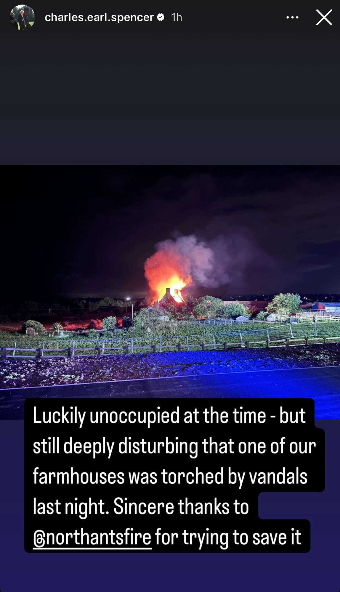 وأوضحت الرسالة أن "الحريق اندلع في أرضٍ تابعةٍ لعقار ألثورب في ميل لين، كينغستورب، نورثامبتون، وليس في منزل ألثورب".