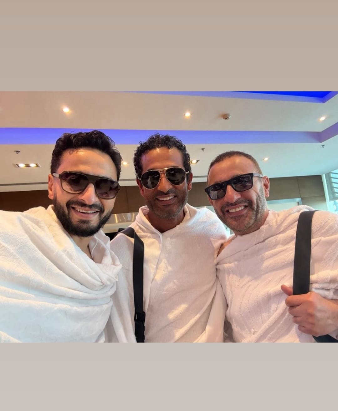 وشارك النجم المصري صوره بالملابس البيضاء خلال توجهه لأداء مناسك الحج مع مجموعة من النجوم.