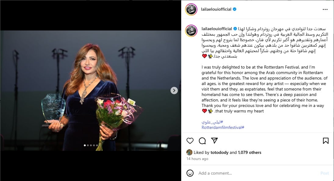 ونشرت ليلى عبر حسابها الخاص في "إنستغرام" مجموعة صور من حفل تكريمها، وعلّقت عليها قائلةً: "سعدت كثيراً لتواجدي في مهرجان روتردام، وشكراً لهذا التكريم وسط الجالية العربية في روتردام وهولندا".