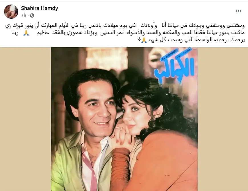 وعلّقت شهيرة على الصورة بكلمات مؤثرة قالت فيها: "وحشتني ووحشني وجودك في حياتنا أنا وأولادك في يوم ميلادك بادعي ربنا في الأيام المباركه أن ينوّر قبرك زي ما كنت بتنوّر حياتنا فقدنا الحب والحكمة والسند والاحتواء".