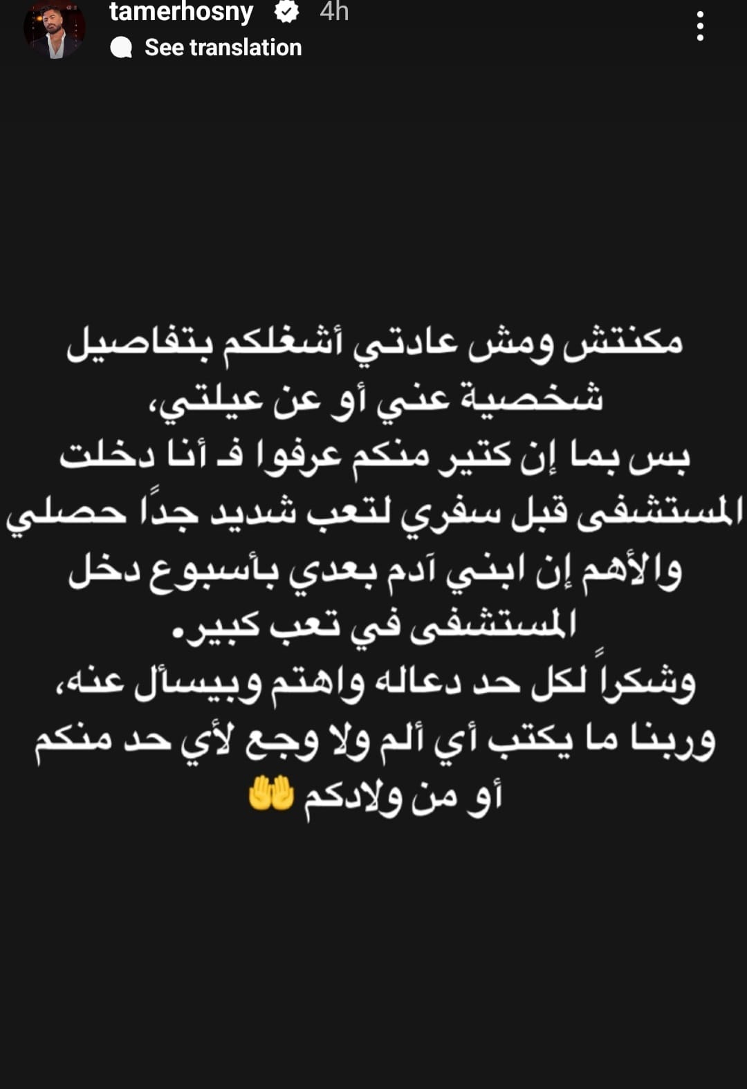 بعد الانتقادات التي وجِّهت إليه لاهتمامه بحفلاته ونشاطاته الفنية وعدم التحدث عن دخول ابنه آدم إلى المستشفى، خرج النجم تامر حسني عن صمته وأوضح الأمر من خلال منشور مقتضب عبر السوشيال ميديا.