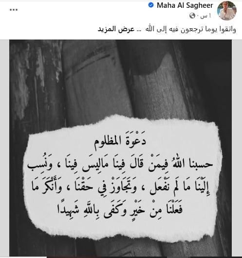 نشرت الإعلامية مها الصغير على حسابها الخاص بـ"فيسبوك" صورة لدعاء وجهت بها رسالة لكل من يكتب عنها أشياء غير صحيحة، في تعليقها الأول بعد انتشار أخبار عن قرب زواجها من الفنان طارق صبري.