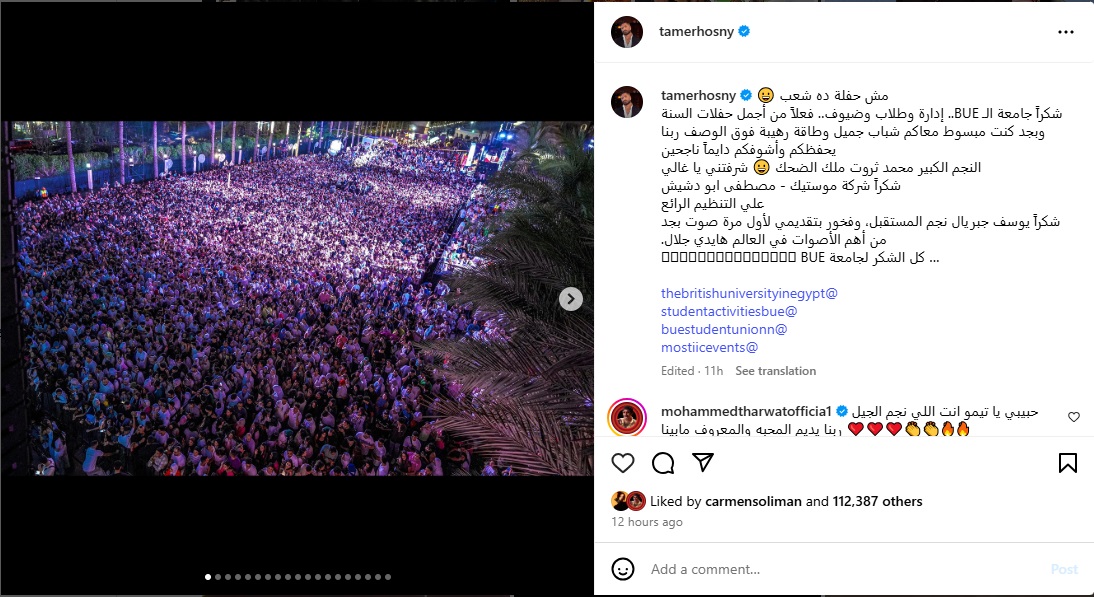 وقال تامر: "مش حفلة ده شعب، شكراً الجامعة... إدارة وطلاب وضيوف... فعلاً من أجمل حفلات السنة وبجد كنت مبسوط معاكم شباب جميل وطاقة رهيبة فوق الوصف ربنا يحفظكم وأشوفكم دايماً ناجحين".