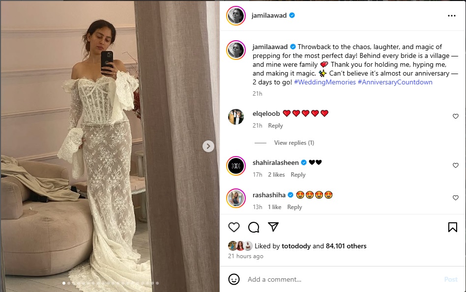 وعلقت جميلة على الصور برسالة مؤثرة قالت فيها: "عودة الى ضحكات وسحر التحضير ليوم مثالي، خلف كل عروس مجموعة كبيرة، وبالنسبة لي كانت عائلتي، شكرًا لكم على احتضاني وتشجيعي، وجعل هذا اليوم ساحرًا، لا أصدق أن ذكرى زواجنا قد اقتربت، لم يتبق سوى يومين".