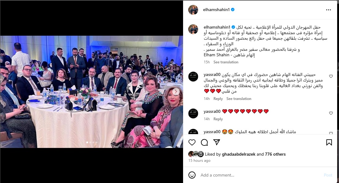 وكتبت إلهام معلقةً على الصور: "حفل "المهرجان الدولي للمرأة الإعلامية" تحية لكل امرأة مؤثّرة في مجتمعها، إعلامية أو صحافية أو فنانة أو ديبلوماسية أو سياسية، تشرّفت بلقائهن جميعاً في حفل رائع بحضور السادة والسيدات الوزراء والسفراء، وشرّفنا بالحضور معالي سفير مصر في العراق أحمد سمير".