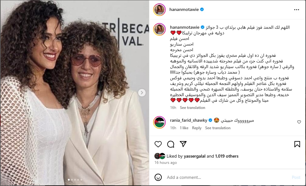 ونشرت حنان على حسابها الخاص بـ"إنستغرام" مجموعة من الصور مع صناع العمل أثناء حضورهم فعاليات المهرجان وعلقت عليها قائلة: "اللهم لك الحمد.. فوز هابي بيرث داي بـ3 جوائز دولية في مهرجان تريبيكا: أحسن فيلم وأحسن سيناريو وأحسن مخرجة".