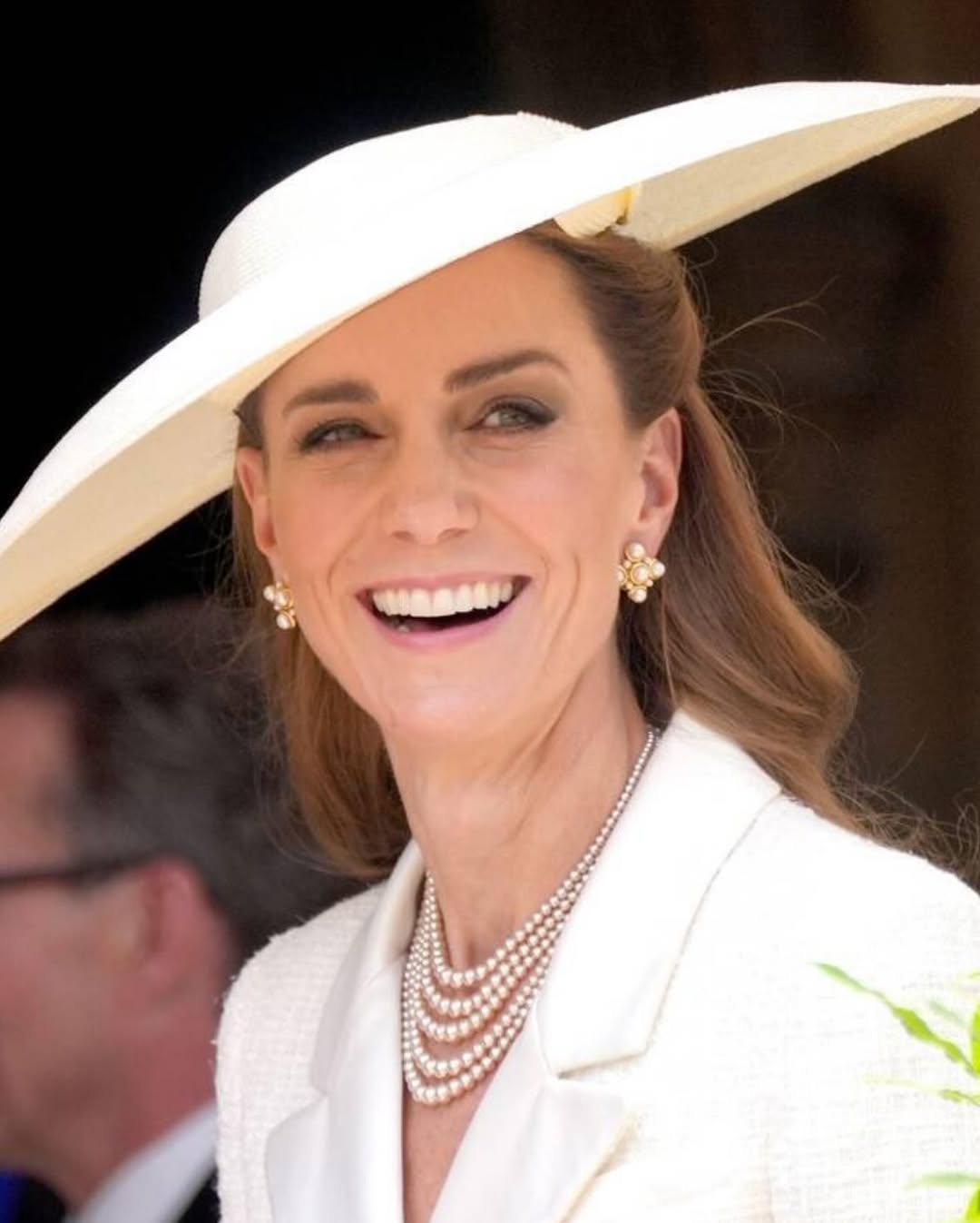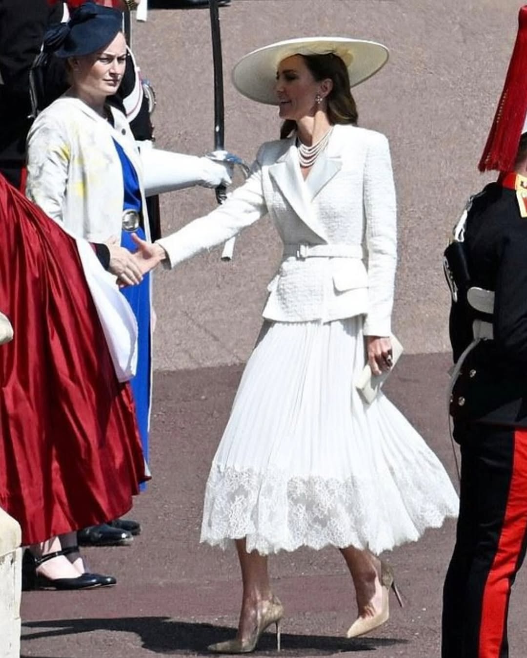 إطلالة كلاسيكية متألقة لدوقة كامبريدج كيت ميدلتون بطقم أبيض أنيق
