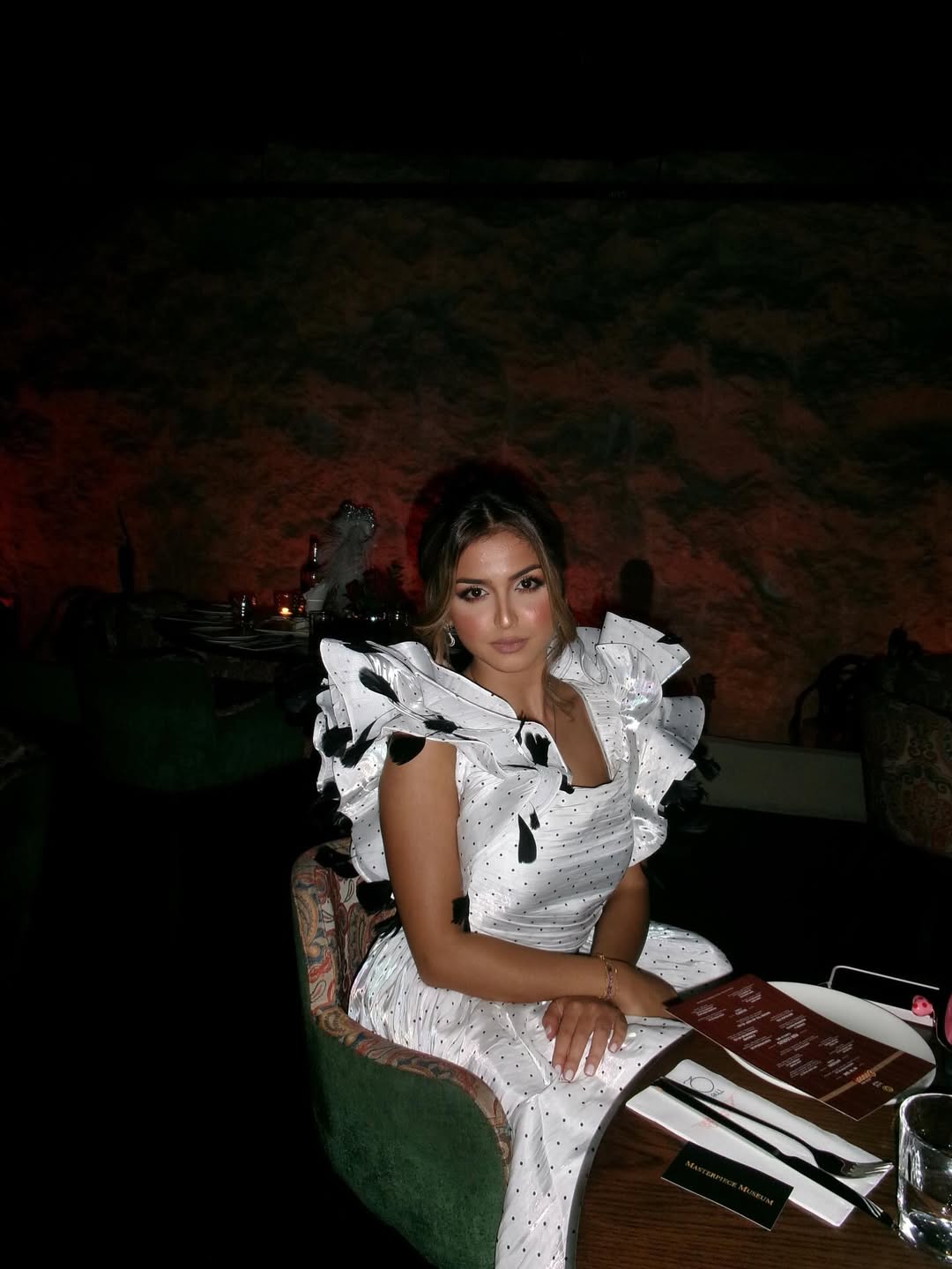 حلا الترك شابة فاتنة بفستان ساتان أبيض منقّط بالأسود