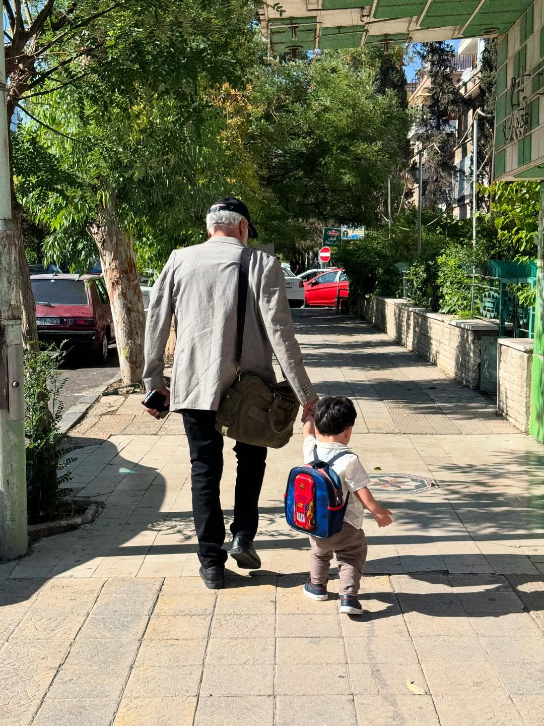 وأرفق الصورة الأولى بتعليق كتب فيه: "مع حفيدي في دمشق أحب المدن الى قلبي".