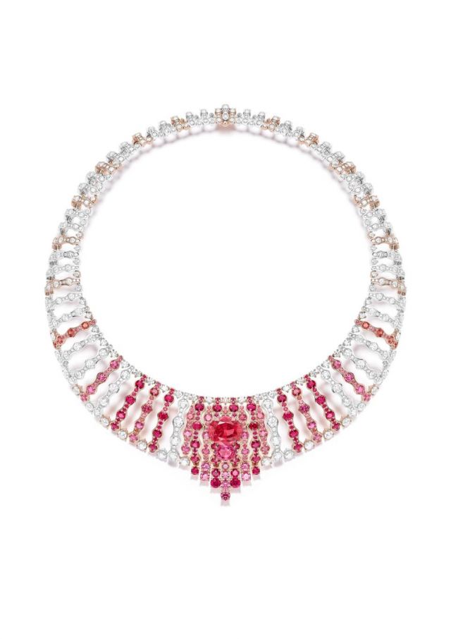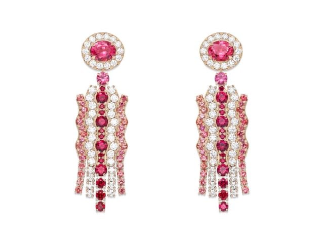 تألّقت الممثلة الكورية الجنوبية وسفيرة الدار العالمية، جيانا جون، بطقم من المجوهرات الراقية Wave Illusion المُصاغ من الذهب الوردي والبلاتين، والمرصّع بأحجار السبينيل الأحمر والزهري، والياقوت الأحمر، والألماس.