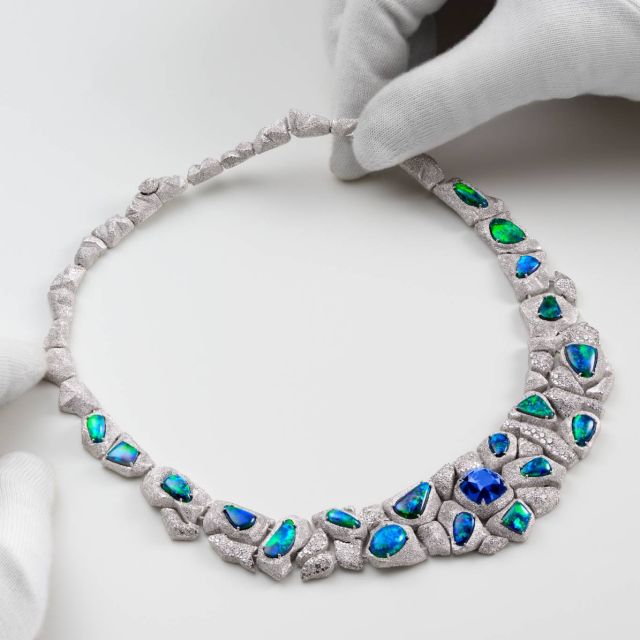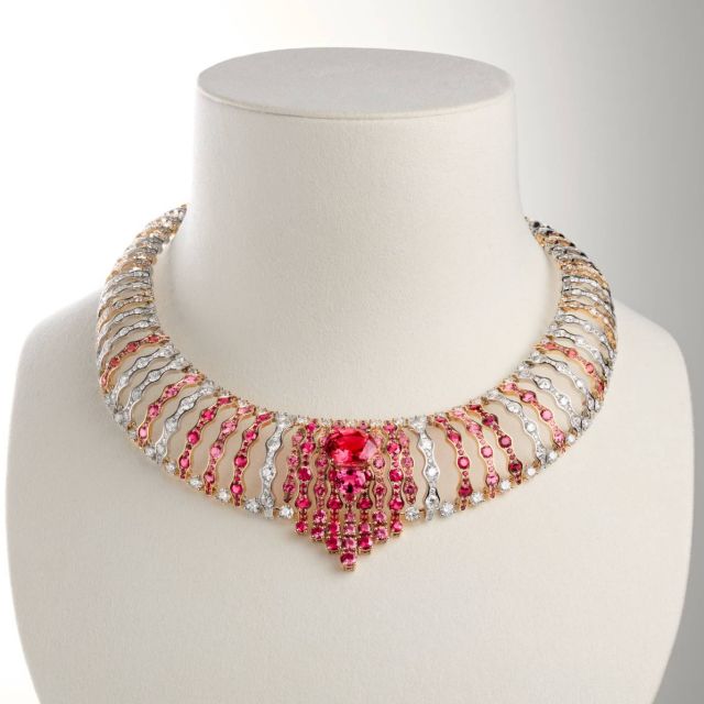 وقد نسّقت عقد السوتوار مع طقم من الذهب الوردي عيار 18 قيراطاً مرصّع بالسبينيل الزهري، والياقوت الأحمر، والألماس، إلى جانب خاتم Pink Delight من الذهب الوردي، تتوسطه قطعة روبيلايت بقطع الوسادة (8.53 قراريط)، وقطعة سبسارتين بقطع الوسادة (4.87 قراريط)، وسافير زهري، وسبسارتين.