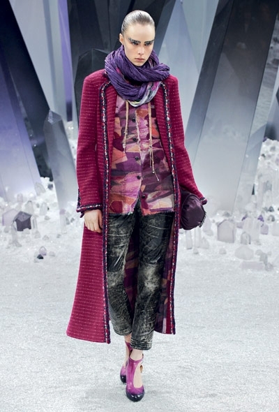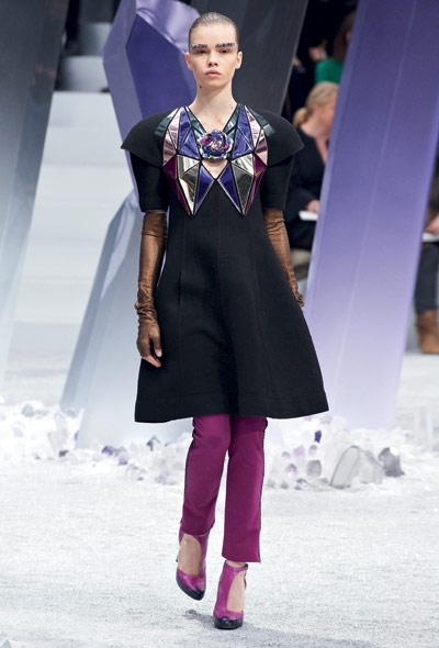 طلة خريف وشتاء 2012/2013 من شانيل Chanel عصرية ومتعددة الأوجه. لقد ابتكر كارل لاغيرفيلد بذلة جديدة مؤلفة من ثلاث قطع، هي عبارة عن فستان مع بنطلون وسترة! تقدم المجموعة أيضاً ملابس جديدة غير منتظرة: سترة طويلة جداً لها كمان دائريان كبيران وهابطان، وبذلة لها ساقان قابلان للفك بسحابين لتتحول إلى معطف. الأحجام كبيرة مع حزام مشدود ودرزات زخرفية تذكرنا بحقيبة Boy Chanel. برزت أيضاً السترات ذات الياقات الكبيرة.