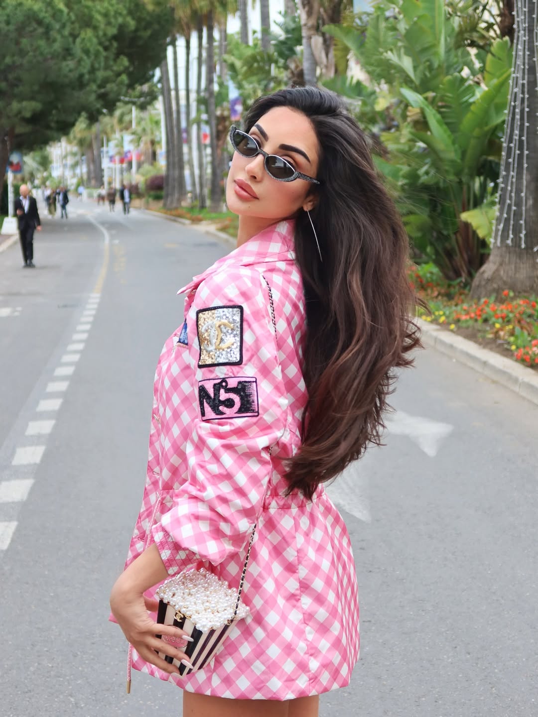 القطعة الأساسية في هذه الإطلالة كانت الجاكيت بأسلوب المربّعات باللونين الزهري والأبيض، وهو تصميم يجمع بين الطابع الكلاسيكي ونفَس شبابي بفضل الطبعات العصرية التي زيّنته. هذا النوع من الجاكيتات يُعدّ من القطع الرائجة حالياً، وقد أعطى نور مظهراً أنيقاً من دون تكلّف، يتناسب مع شخصيتها المرِحة وروحها النابضة بالحياة.