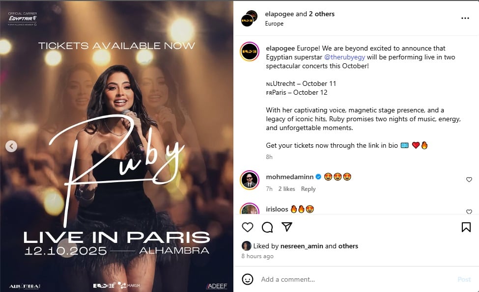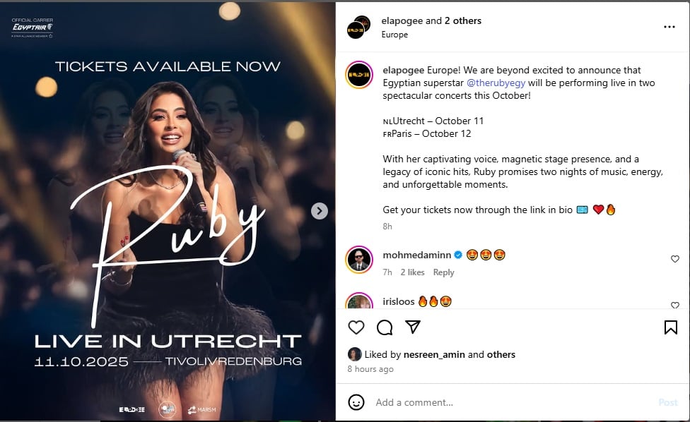 ونشرت روبي، على حسابها الخاص بـ"إنستغرام" بوستر الحفلين، حيث تحيي حفلها الأول، يوم 11 تشرين الأول (أكتوبر) المقبل بمدينة أوترخت الهولندية، والثاني في العاصمة الفرنسية باريس، في اليوم التالي مباشرة الموافق 12 من نفس الشهر.