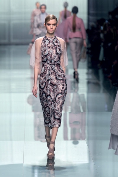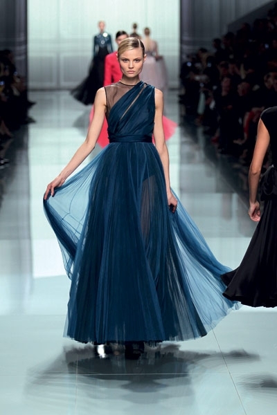 عناوين كثيرة طرحتها منصة دار ديور هذا الموسم عاد بها بيل غايتن إلى أرشيف الدار، كسترة Bar Jacket وتحديد منطقة الخصر بشكل عام عبر قصات أنثوية مطوّقة عبر حزام أو عقدة. برزت منطقة الكتفين بشكل مثير للأنوثة، دون كمّين أو مع ياقة مميّزة. لم يتفرّد نقش ال«بييه دو بول» على المنصة بل طبعت أزياء الشتاء تفاصيل إثنية نارية وزاهية. الحرير بألوان الباستيل والجلد الرمادي والتويد الداكن والموهير والكاشمير، أسياد المنصة بامتياز. أما الطول المثالي لأزياء دار ديور هذا الموسم، التنانير المثنية والمتفتحة بخفّة والفساتين الصغيرة والسراويل، فهو يتجاوز الركبة دون الكاحل.