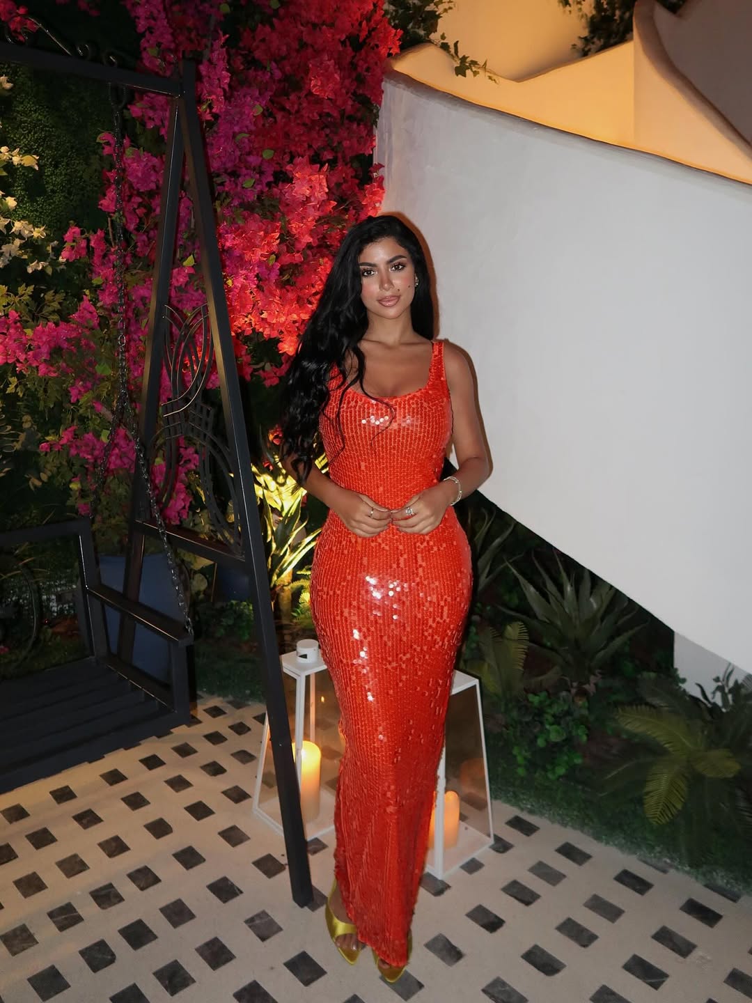 واختارت النجمة المصرية فستاناً ناعماً من الترتر اللامع باللون البرتقالي المبهر، وتميّز بتصميمه المجسّم الذي يبرز رشاقتها وقوامها الممشوق، وجاء بحمّالات عريضة مع فُتحة دائرية عند الصدر وفُتحة جانبية عند القدم.