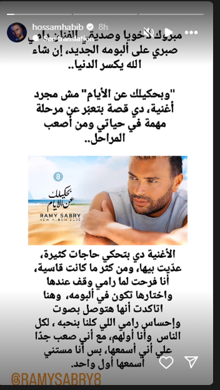 وهنّأ حسام، عبر خاصية القصص المصوّرة الملحقة بحسابه الرسمي في "إنستغرام"، رامي على الألبوم، وكتب قائلاً: "مبروك لأخويا وصديقي الفنان رامي صبري على ألبومه الجديد، إن شاء الله يكسر الدنيا، "وبحكيلك عن الأيام" مش مجرد أغنية، دي قصة بتعبّر عن مرحلة مهمة في حياتي ومن أصعب المراحل".