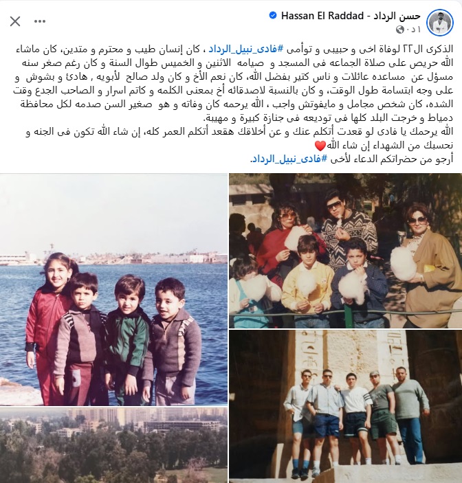 وعلّق الرداد على الصور بمنشور مؤثّر، قال فيه: "الذكرى الـ22 لوفاة أخي وحبيبي وتوأمي فادي نبيل الرداد، كان إنسان طيب ومحترم ومتدين، كان ما شاء الله حريص على صلاة الجماعة في المسجد وصيامه الاثنين والخميس طوال السنة، وكان رغم صغر سنه مسؤول عن مساعدة عائلات وناس كتير بفضل الله، كان نعم الأخ وكان ولد صالح لأبويه، هادئ وبشوش وعلى وجهه ابتسامة طول الوقت".
