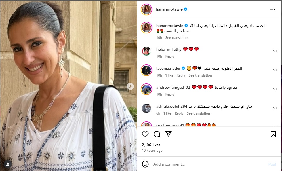 وكتبت حنان على الصور قائلة: "الصمت لا يعني القبول دائما، أحيانا يعني أننا قد تعبنا من التفسير".