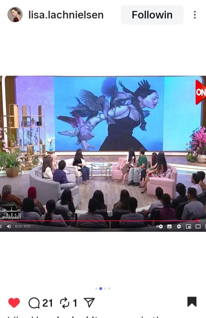 أضافت: "مها الصغير قالت في لقائها مع منى الشاذلي إنها غاوية رسم، وعرضت بعض لوحاتها على الشاشة. اللوحات كلها مسروقة.. منها لوحة لفنانة دنماركية اسمها Lisa Lach-Nielsen، ناشرة على إنستغرام صورة لوحتها (صنعت لنفسي أجنحة) المرسومة عام ٢٠١٩، وصورة نفس اللوحة من برنامج منى الشاذلي، وبتتعجب من البجاحة!".