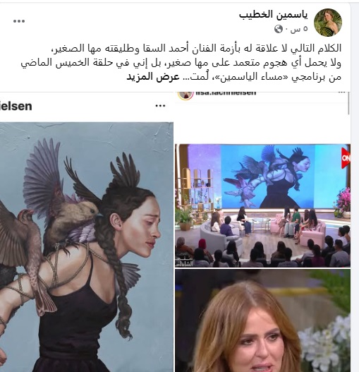 قامت الإعلامية ياسمين الخطيب بعرض منشور الفنانة التشكيلية العالمية، وذلك على حسابها الخاص بـ"فيسبوك"، وعلقت عليه برسالة هجوم على مها الصغير قالت فيها: "الكلام التالي لا علاقة له بأزمة الفنان أحمد السقا وطليقته مها الصغير، ولا يحمل أي هجوم متعمد على مها صغير، بل إني في حلقة الخميس الماضي من برنامجي (مساء الياسمين)، لُمت الفنانة فريدة سيف النصر بسبب هجومها على الصغير".