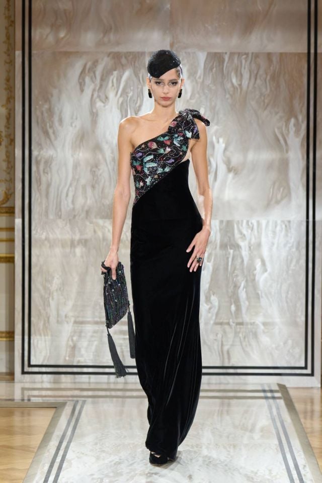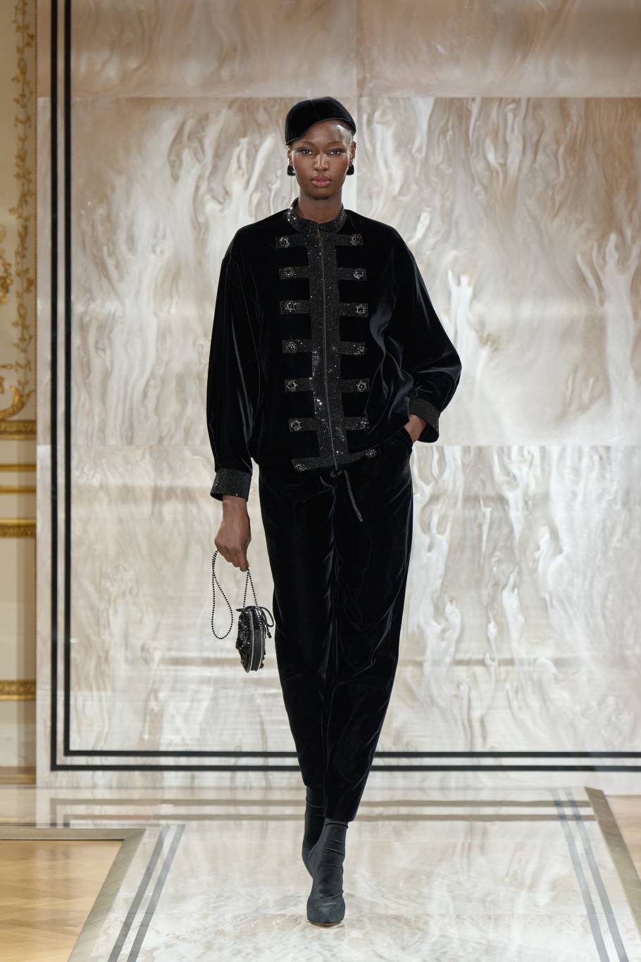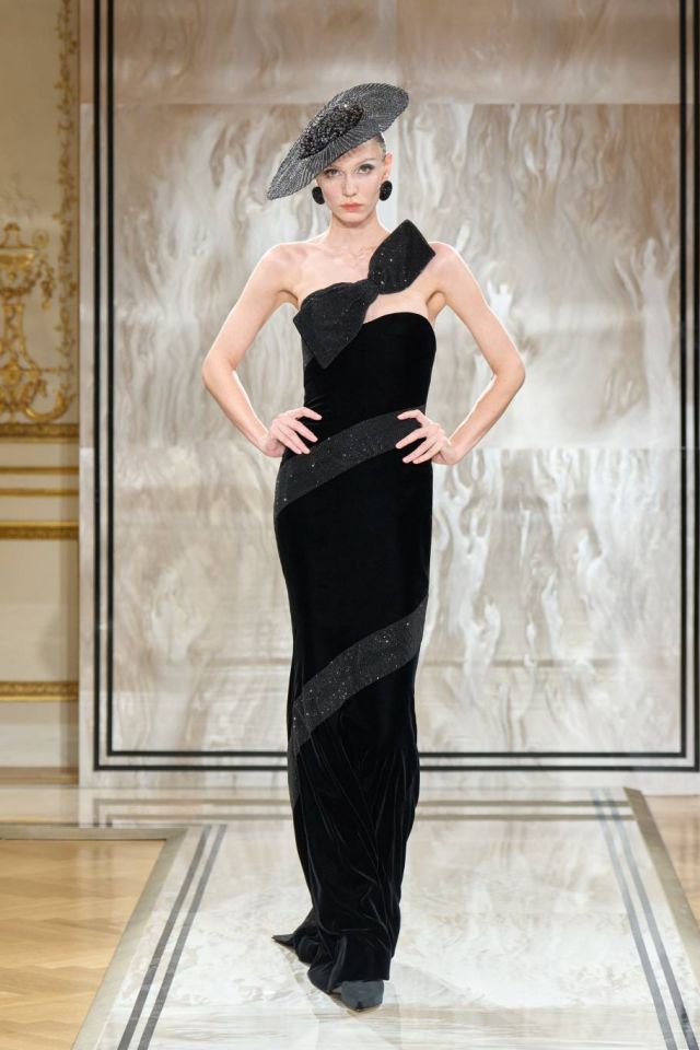 يتباهى الأسود بسحره على منصة العرض ملوّناً فساتين انسيابية مزيّنة بتطريزات زاهية، إلى جانب بدلات التوكسيدو والمعاطف الرسمية التي تمّت اعادة تخيلها، وسترات منحوتة تُرتدى مباشرةً على البشرة، إضافة الى سترات بليزر في تناغم رائع مع قمصان بيضاء، وربطات عنق منقوشة، وبناطيل ذات قصّات ضيّقة.