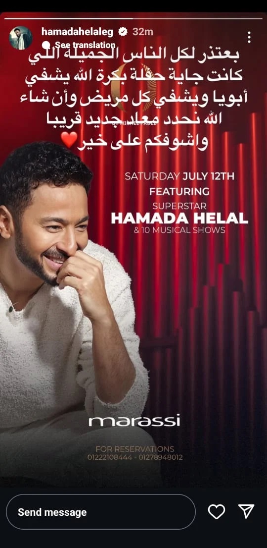 نشر الفنان حمادة هلال على خاصية القصص المصورة الملحقة على حسابه الخاص بـ"إنستغرام" منشوراً فاجأ به جمهوره حيث أعلن اعتذاره عن حفله الغنائي، الذي كان من المقرر أن يحييه مساء اليوم (السبت) 12 تموز (يوليو) بمهرجان مراسي بالساحل الشمالي.