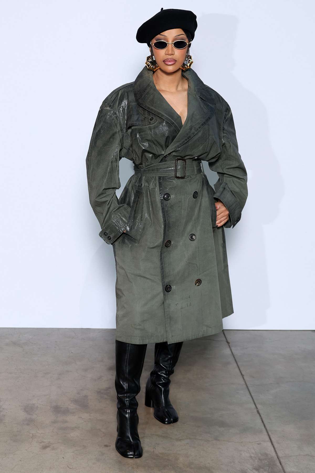 في التاسع من تموز، حافظت "باربي حي برونكس" على بساطة وأناقة إطلالة ميزون مارجيلا في الصف الأمامي. بدت كاردي أنيقة مرتديةً معطف ترنش رمادي داكن مطلي بالشمع مع حزام، وقد نسقته مع حذاء طويل من الجلد الأسود. سارت الفنانة بتبختر في شوارع العاصمة الفرنسية عند وصولها إلى العرض، بإطلالة باريسية أنيقة للغاية مرتديةً قبعة بيريه سوداء مزينة بأقراط ذهبية كبيرة وعصرية، ونظارات شمسية بيضاوية بإطار ذهبي.