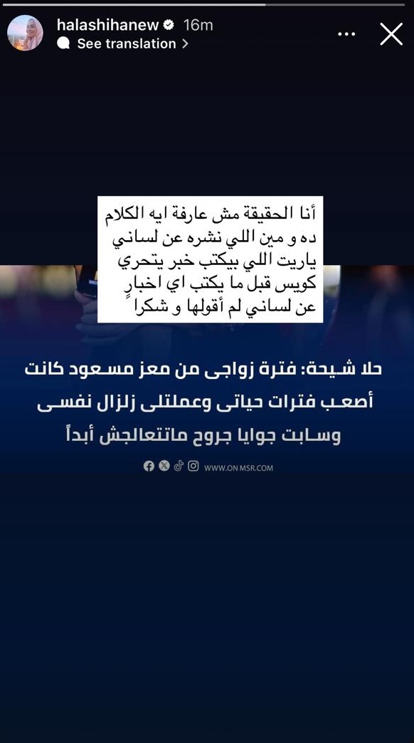 ونشرت حلا عبر خاصية القصص المصوّرة الملحقة بحسابها الرسمي في موقع "إنستغرام" صورة لعنوان أحد الأخبار المنتشرة والذي يقول "حلا شيحة: فترة زواجي من معز مسعود كانت أصعب فترات حياتي وعملتلي زلزال نفسي وسابت جوايا جروح متتعالجش أبداً"، وعلّقت حلا على الخبر قائلةً: "مش عارفة إيه الكلام ده ومين اللي نشره على لساني؟! ياريت اللي يكتب خبر يتحرى الدقة كويس قبل ما يكتب أي حاجة عني... أنا مقلتش الكلام ده نهائي".