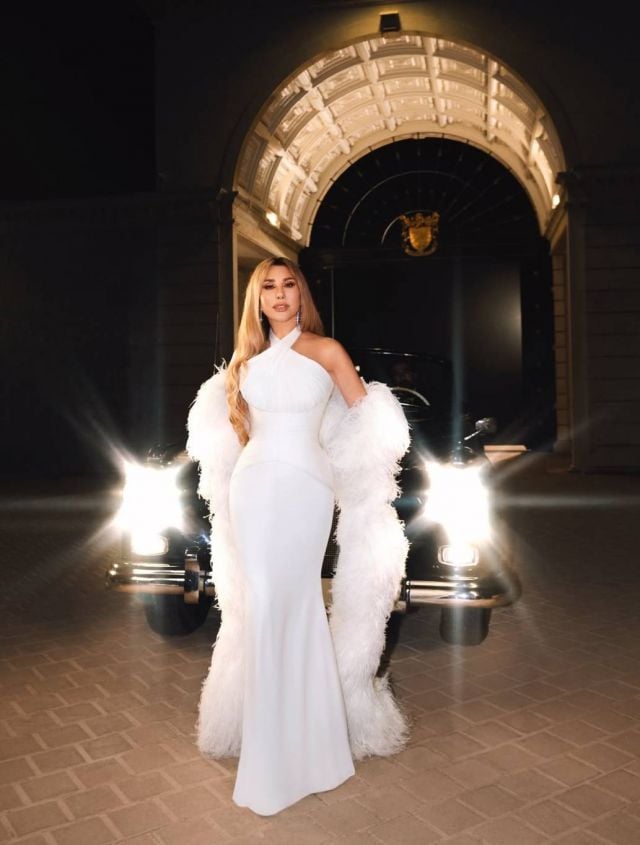 واختارت "شمس الأغنية اللبنانية" فستاناً مختلفاً تماماً بالللون الابيض واعتمدت فيه على صيحة الكورسيه الضيق من الأعلى مع حركة الرقبة الملتفة لينسدل نحو الأسفل بتصميم طويل وبسيط. وتمكنت نجوى من أخذ القطعة الى مكان آخر بإضافة "كاب" من الريش الناعم اعتمدته على شكل اكمام، وهو ما اضاف المزيد من الفخامة والأنوثة الى اطلالتها.