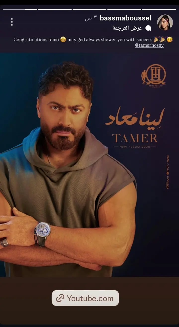 فاجأت الفنانة المغربية بسمة بوسيل جمهورها ونشرت عبر خاصية القصص المصوّرة الملحقة بحسابها الخاص في "إنستغرام" بوستر ألبوم طليقها النجم تامر حسني الجديد "لينا معاد"، وجّهت إليه من خلاله رسالة تهنئة بصدور الألبوم، مؤكدةً استمرار علاقة الاحترام والدعم المتبادل بينهما رغم الانفصال.