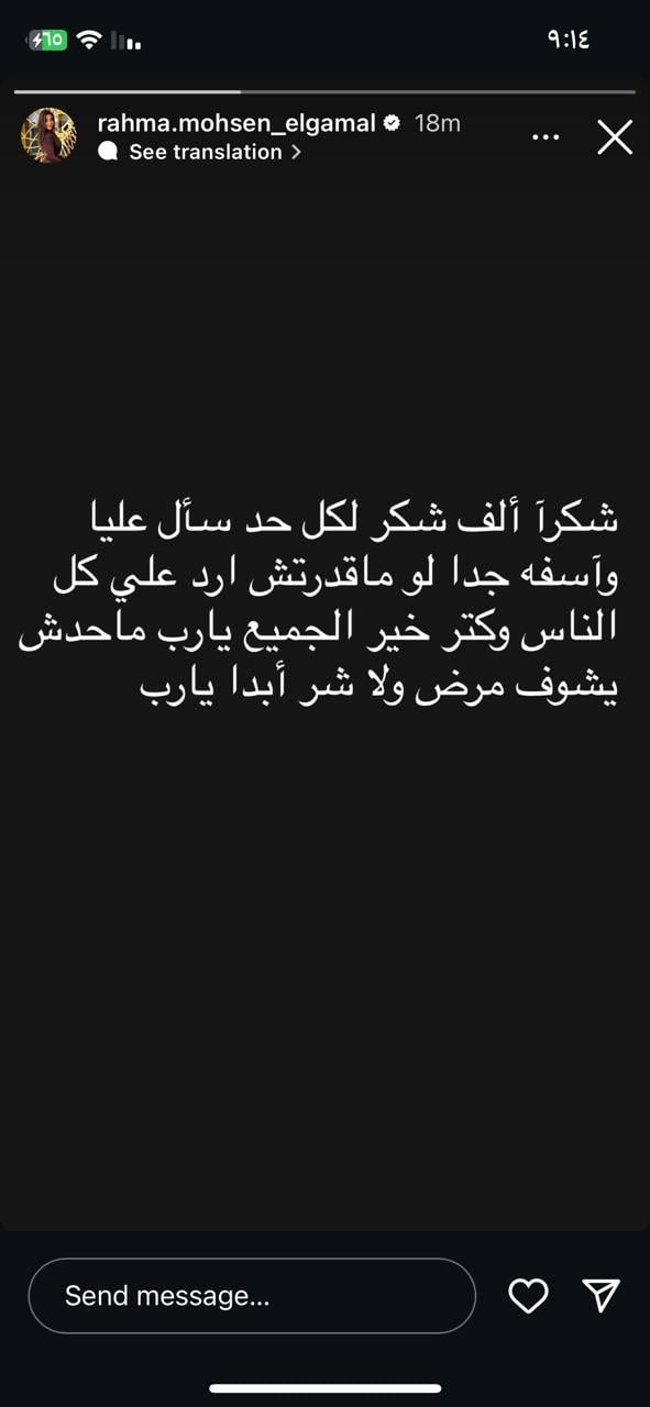 في تعليقها الأول بعد تعرضها خلال الأيام الماضية لأزمة صحية، نقلت على أثرها الى أحد المستشفيات، حيث أُجريت لها عملية جراحية في المعدة، كتبت الفنانة رحمة محسن عبر حسابها الرسمي في موقع التواصل الاجتماعي "إنستغرام" قائلةً: "شكراً ألف شكر لكل حد سأل عليا... وآسفة جداً لو ماقدرتش أرد على كل الناس، وكتّر خير الجميع يا رب ماحدش يشوف مرض ولا شر أبداً يارب".