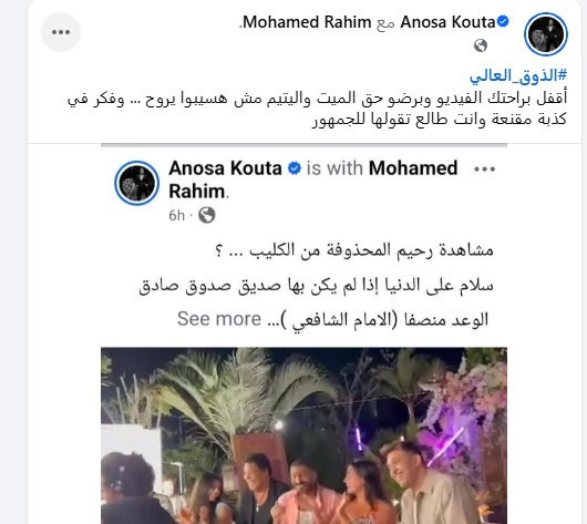 وكتبت أنوسة كوتة، عبر حسابها الخاص على "فيسبوك": "أقفل براحتك الفيديو وبرضو حق الميت واليتيم مش هسيبوا يروح، وفكر في كذبة مقنعة وأنت طالع تقولها للجمهور".