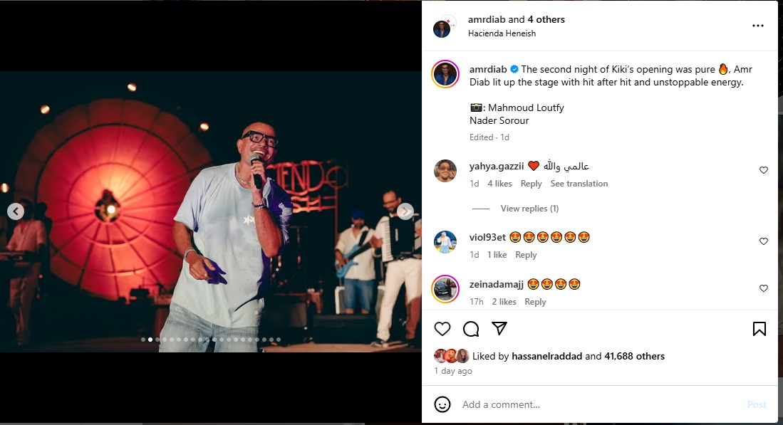 في تعليقه الأول على نجاح الحفل الذي أحياه لصالح إحدى شركات العقارات، في منطقة سيدي حنيش في الساحل الشمالي، نشر الفنان عمرو دياب عبر حسابه الرسمي في "إنستغرام" مجموعة صور من الحفل، وكتب معلّقاً عليها: "كانت هذه الليلة نارية... عمرو دياب أشعل المسرح بأغنية تلو الأخرى وطاقة لا تتوقف".