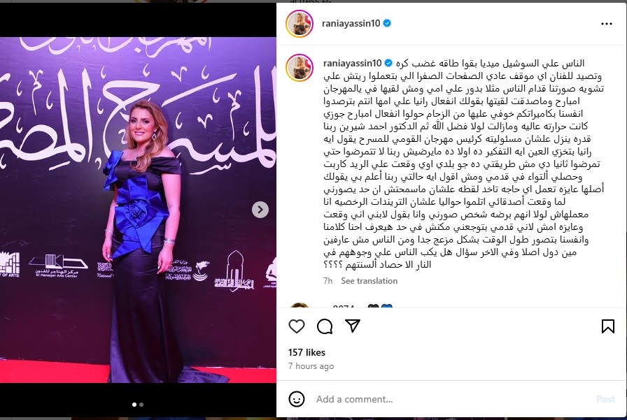 وعلّقت رانيا على الصورة موجهةً انتقادات حادة الى بعض مستخدمي مواقع التواصل الاجتماعي، متهمةً إياهم بتحريف الوقائع وتضخيم المواقف التي تحدث معها، وتحويلها الى ما وصفته بـ"الترندات الرخيصة"، مؤكدةً أن ما بدر منها كان بدافع القلق والخوف على أسرتها، وليس كما تم تداوله.