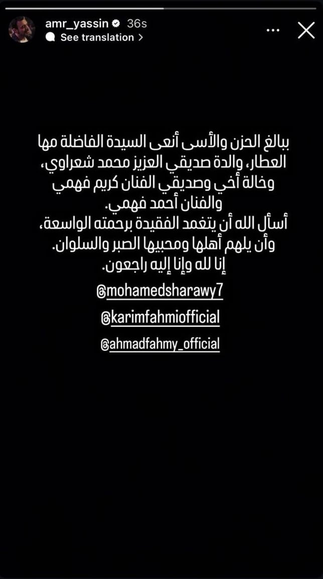 وكتب عمرو قائلاً: "ببالغ الحزن والأسى أنعى السيدة الفاضلة مها العطار، والدة صديقي العزيز محمد شعراوي وخالة أخي وصديقي الفنان كريم فهمي والفنان أحمد فهمي، أسأل الله أن يتغمّد الفقيدة برحمته الواسعة، وأن يُلهم أهلها ومحبّيها الصبر والسلوان، إنّا لله وإنّا إليه راجعون".