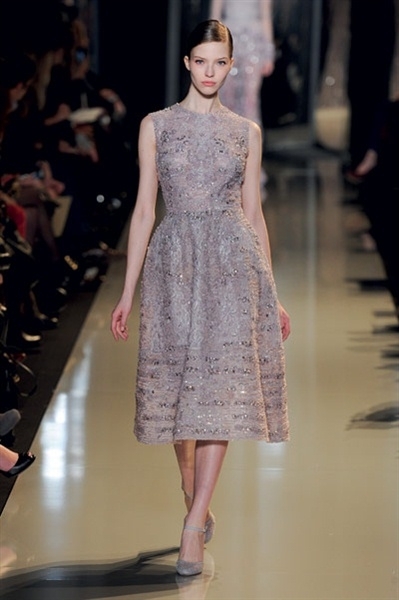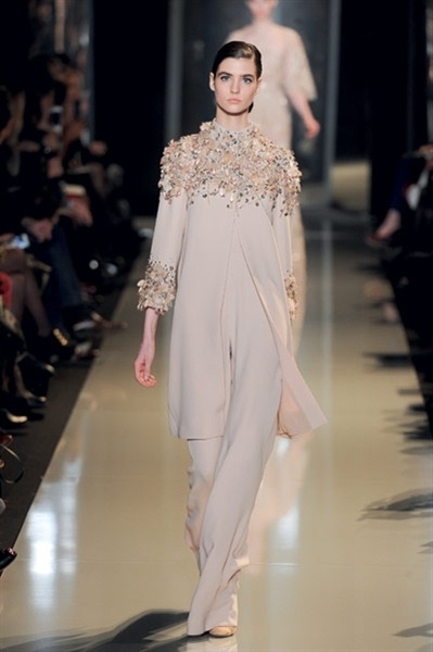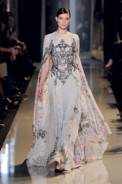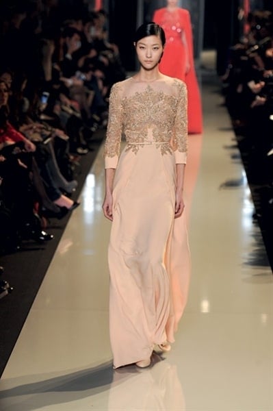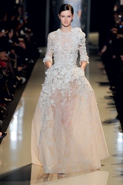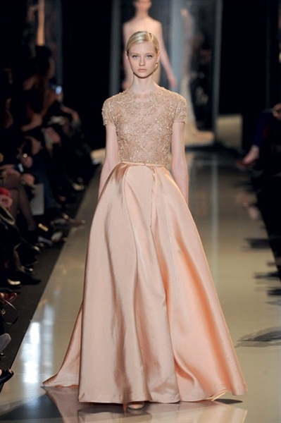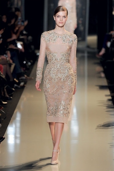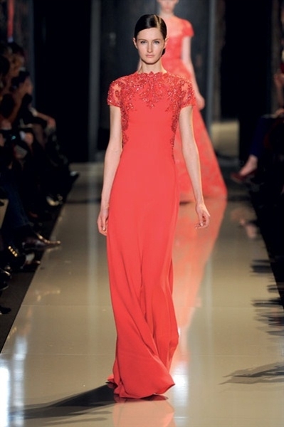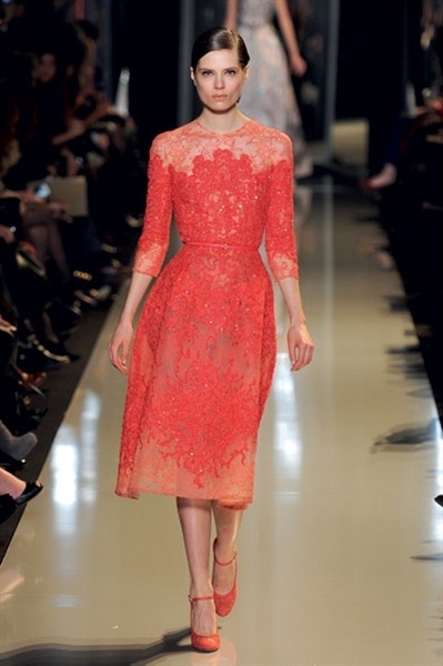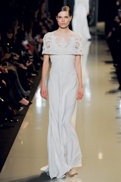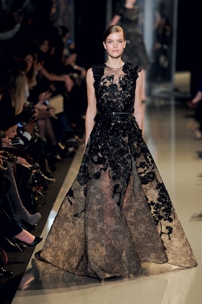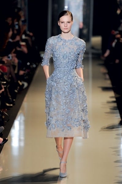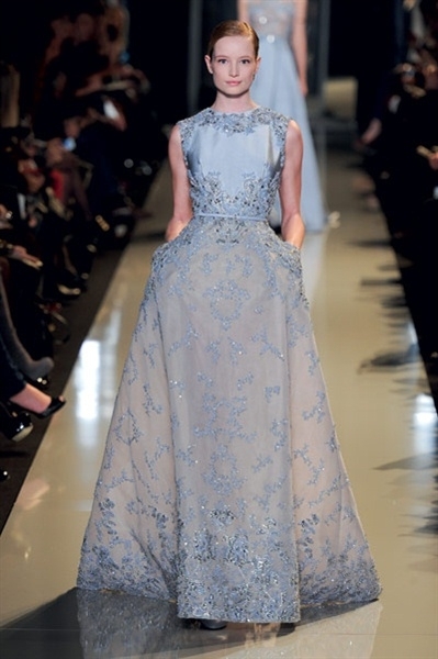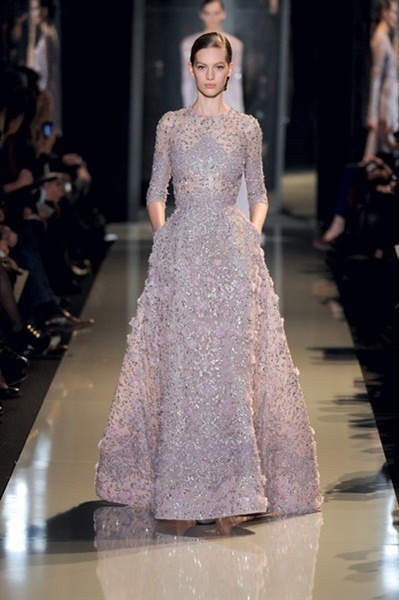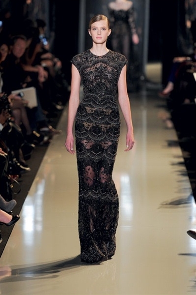 يعرف الجميع ما يمكن توقعه في عروض أزياء إيلي صعب، وقد امتلك هذا العرض الجاذبية والزخرفة، وإنما في أفضل حالاتها. سواء أعجبك الأمر أم لا، فإن إيلي صعب موجود دوماً على السجادة الحمراء وفساتينه الرائعة محط طلب كبير. هذا الموسم، تمت السيطرة على التخريمات الدقيقة والتطريزات الكثيفة. فهذه المجموعة متواضعة مع الأكمام الطويلة وقصات الياقة فوق الكتفين، مع حواش تصل إلى الركبة. تبدو هذه المجموعة مناسبة لأميرة، وكانت هناك إشارة ربما إلى الأميرة غرايس دو موناكو. قرر صعب الابتعاد عن التطريزات الكثيفة في بعض تصاميمه واعتماد الدقة. ازدانت الفساتين الطويلة بتطريزات الكريستال، وإنما كانت أقل من المعتاد. في بعض الفساتين، بقيت مبعثرة على الصدور، والتفت الفساتين بقماش الكريب المتمايل مع حركات العارضات. أتاح ذلك تأمل القصات الأنثوية الرائعة.