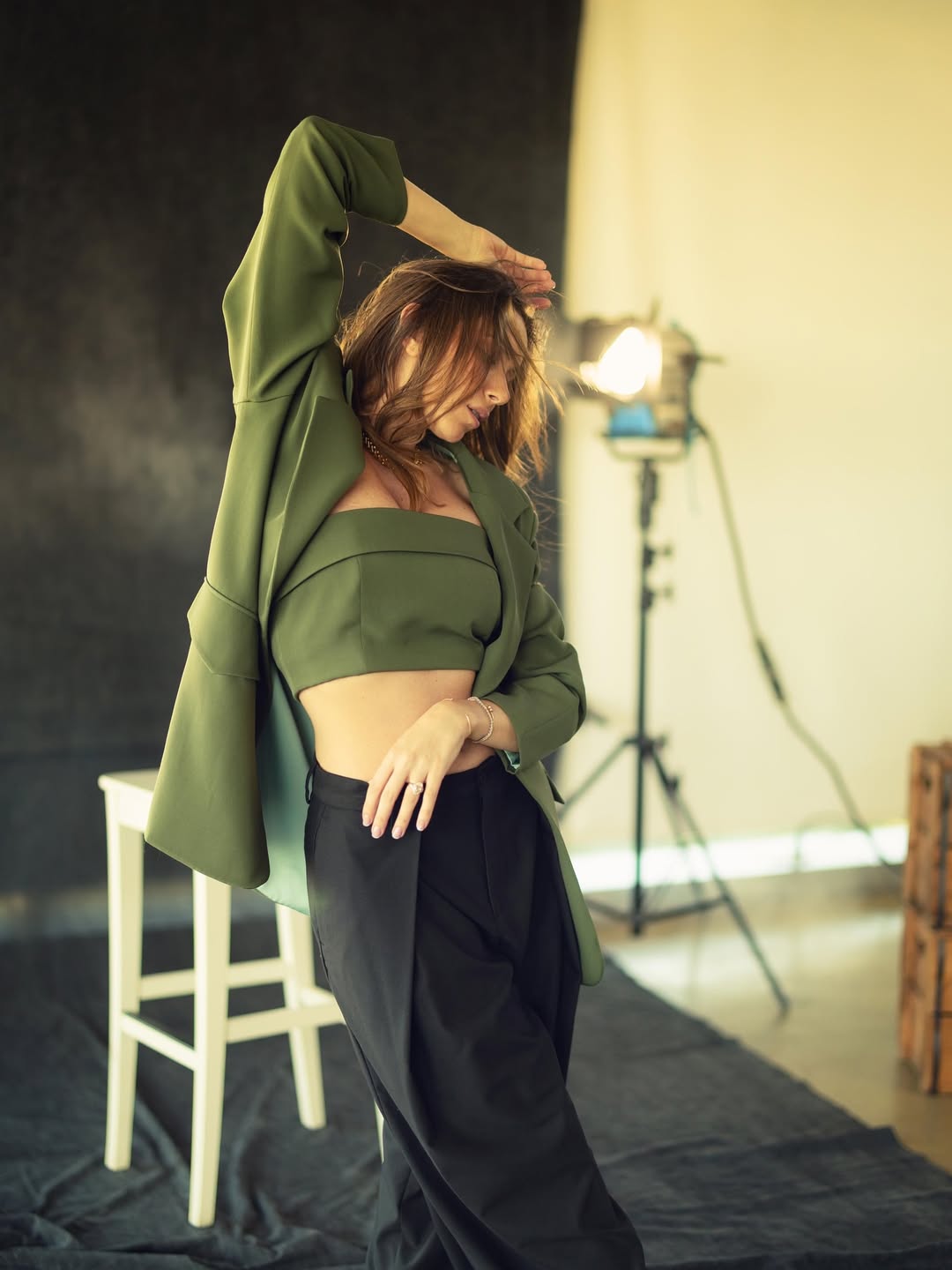 في هذه الإطلالة، اختارت دانييلا كروب توب باللون الزيتي، قطعة تعكس الطابع العصري الجريء، نسّقتها مع بليزر باللون نفسه، ما أضفى على الطلّة لمسة من التوازن بين العملية والرقي. أما المفاجأة فكانت في اختيارها لـبنطلون أسود بتصميم كلاسيكي ولكن بلمسة غريبة وغير تقليدية، ما أضاف عنصر التميز والابتكار على الإطلالة ككل.