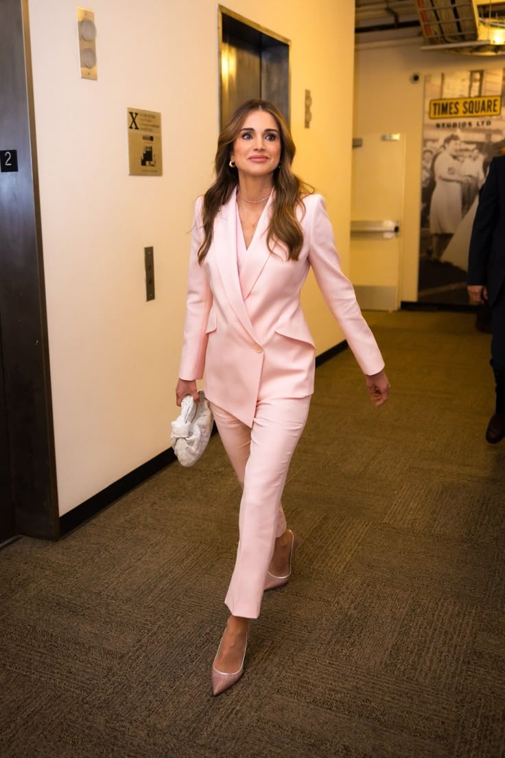 تُعرف الملكة رانيا بذوقها الرفيع الذي يجمع بين الكلاسيكية العصرية واللمسات الجريئة. وفي إطلالاتها الرسمية أو حتى المناسبة لأيام العمل أو الزيارات الاجتماعية، تظهر البدلة كخيار بارز ومتكرّر، لكن بأسلوب لا يشبه أحداً سواها.