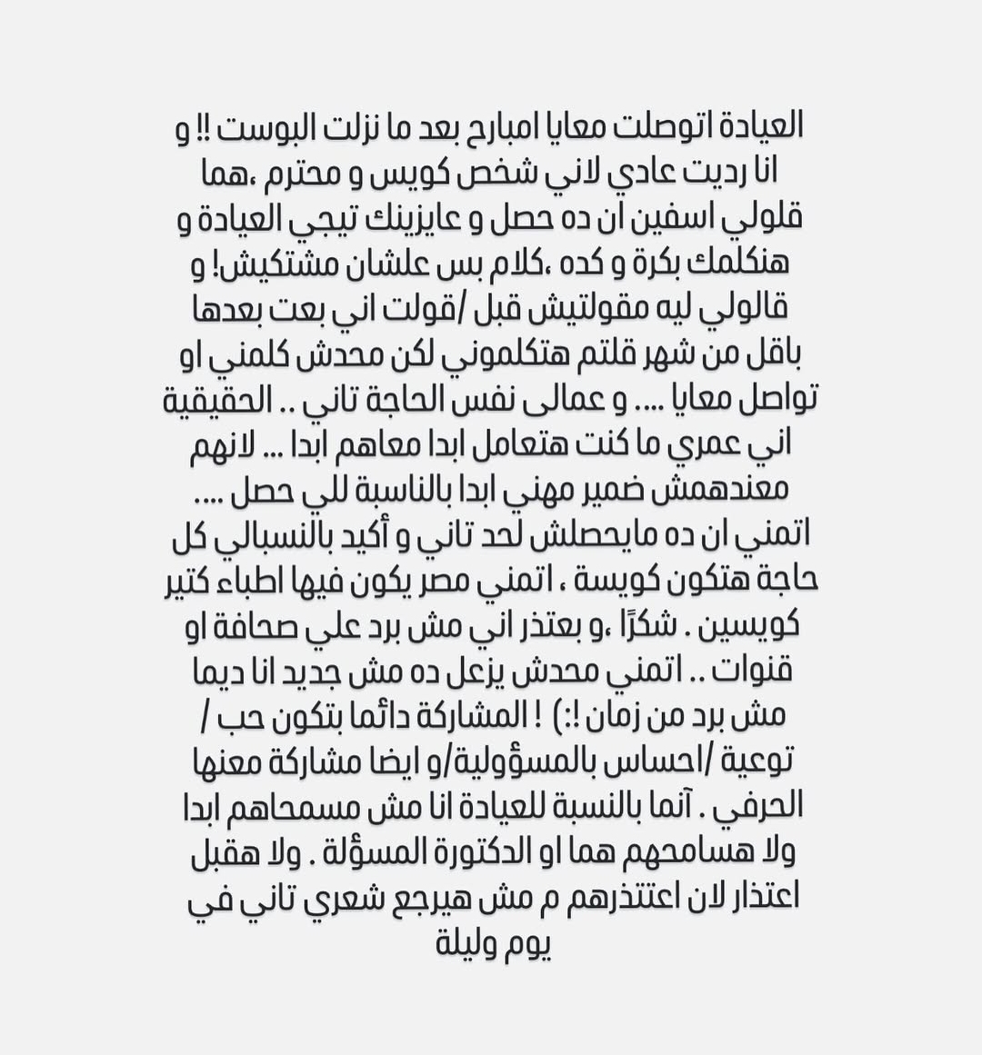 روت رحمة أن العيادة تواصلت معها عقب عرضها منشوراً حول الواقعة، قالت فيه: "العيادة كلّمتني بعد البوست، وأنا رديت لأنني إنسانة محترمة؛ قالوا آسفين وعايزينك تيجي، وهنتواصل بكرة، وكل الكلام ده علشان ما اشتكيش".