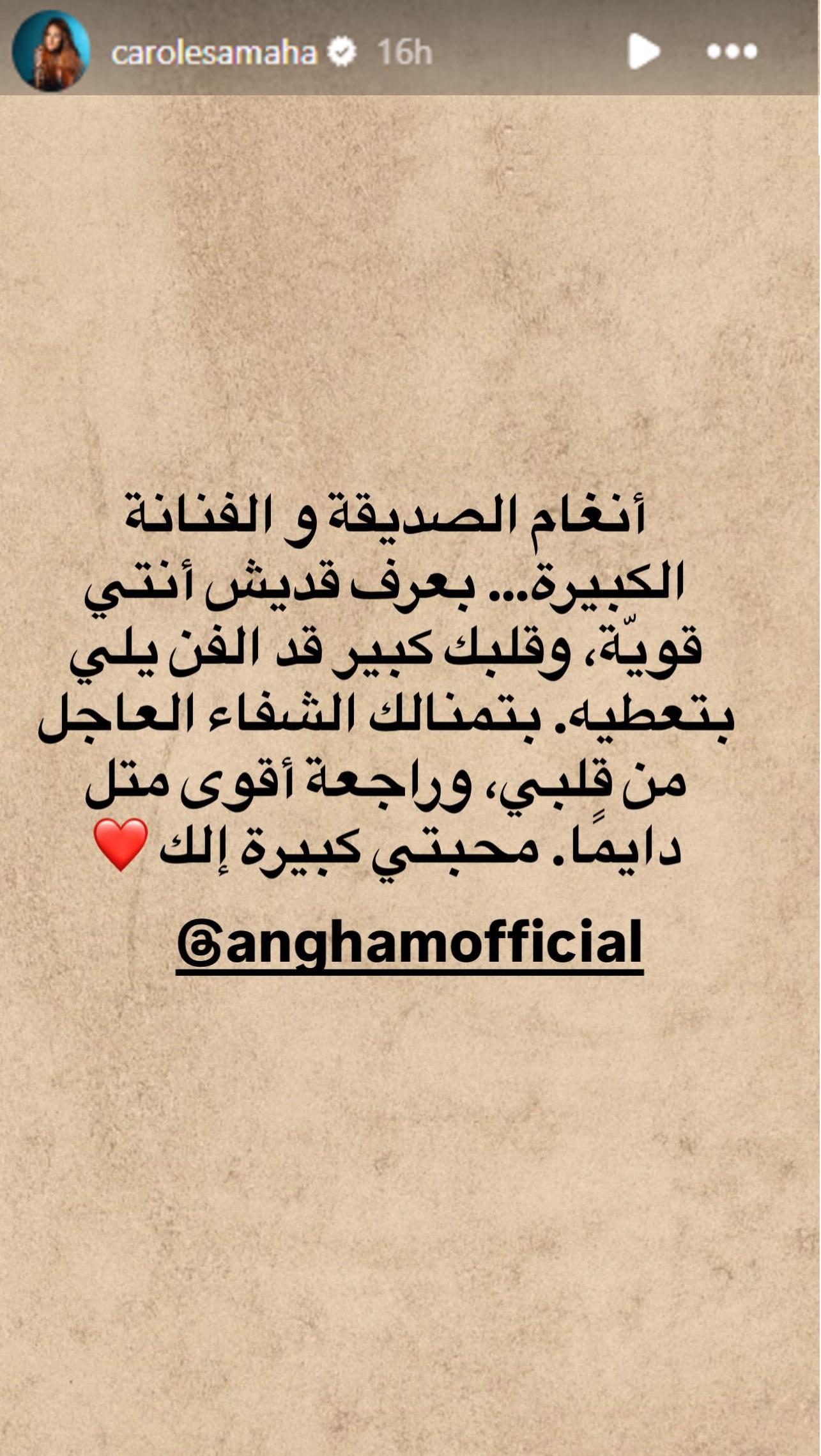 وقالت كارول عبر خاصية القصص المصوّرة الملحقة بحسابها الخاص في "إنستغرام": "أنغام الصديقة والفنانة الكبيرة... أنتي قوية وقلبك كبير قد الفن اللي بتعطيه، بتمنالك الشفاء العاجل من قلبي، وراجعة أقوى مثل دايماً... محبتي الكبيرة لك".