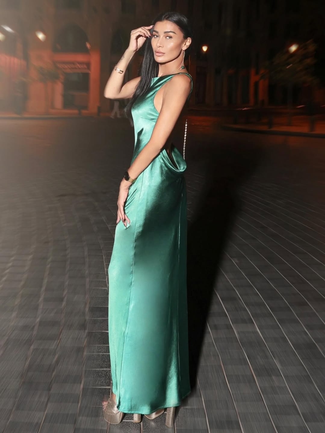 واختارت الممثلة اللبنانية فستاناً أنيقاً جمع بين الكلاسيكية البسيطة والجرأة، ومشت على السجادة الحمراء بفستان من الساتان الأخضر اللامع بتصميم ناعم ومجسّم بالكامل مع فُتحة جريئة وواسعة عند الظهر وبقصّة رقبة ملتفّة تمتد منها سلسلة فضية طويلة تصل إلى أسفل ظهرها، في حركة أضافت المزيد من الفخامة والأناقة الى إطلالتها.