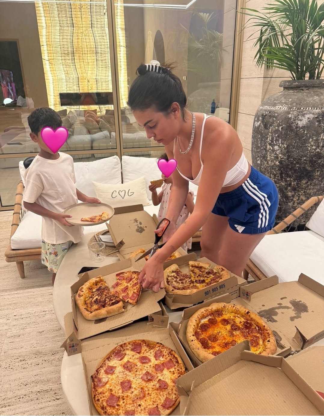 وظهرت رودريغيز في صور أخرى وقد أخفت ملامح ابن كريستيانو من حبيبته السابقة للحفاظ على خصوصيته، وكانت تقطع البيتزا وتوزّعها على أولادها الخمسة بكل حب واهتمام.