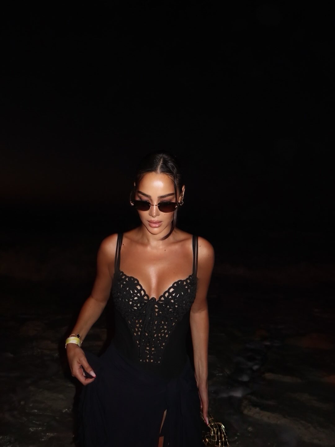 لفتت الفنانة المغربية بسمة بوسيل الأنظار خلال عطلتها الصيفية بفستان أسود أنيق يناسب البحر، تميز بصدرية كورسيه مزيّنة بتطريزات مفرغة من الكروشيه على شكل أوراق الشجر، مع تنورة قصيرة وواسعة بنفس النقوش المفرغة عند أطرافها، وأكملت إطلالتها بحقيبة يد ذهبية ناعمة ونظّارات شمسية سوداء.